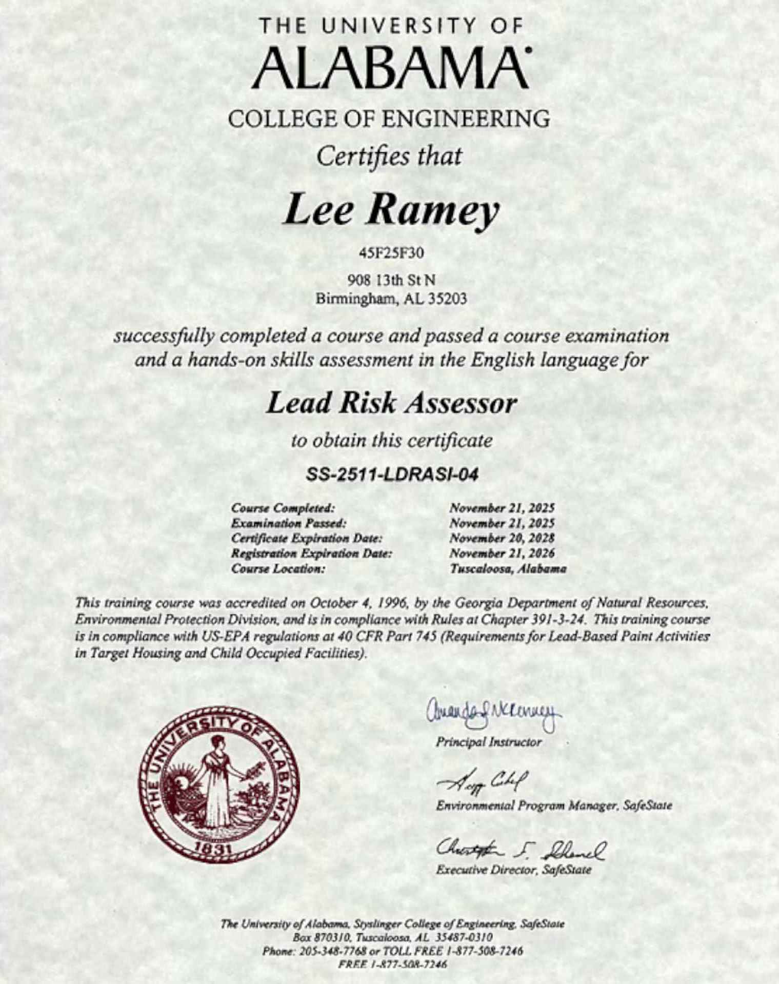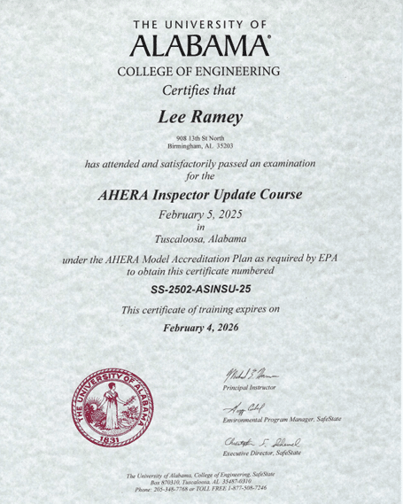 - AHERA Asbestos Inspector Certified # 20-006-14