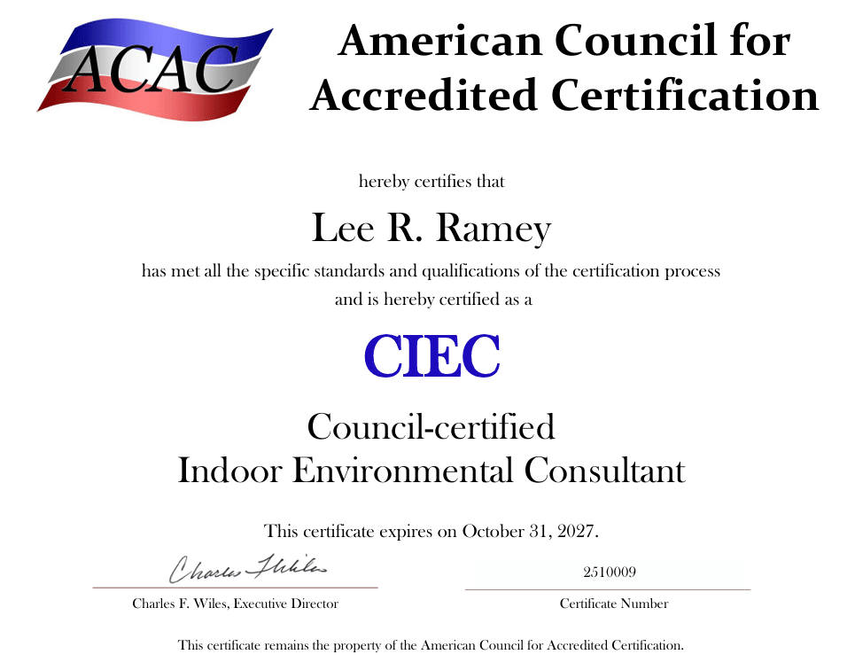 - CIEC (Council Certified Indoor Environmental Consultant Board Certified #2510009